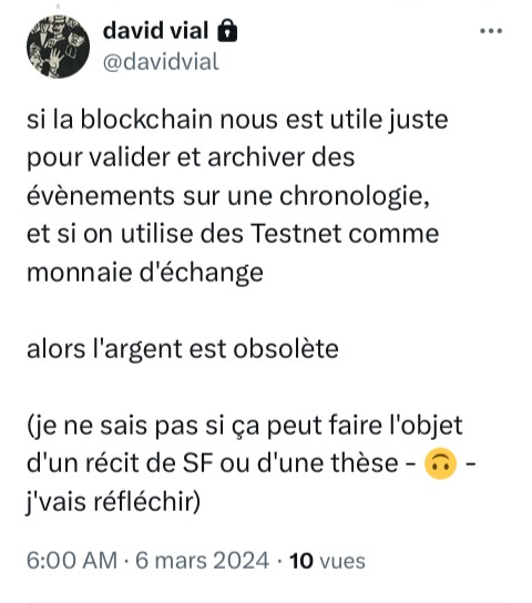 De ce point de vue, les cryptos monnaies sont une évolution vers l’autonomie individuelle comme vers l’intelligence collective dans la mesure où elles sont abordées comme des supports de validation - dans le temps et sur une blockchain - des transactions et des échanges nécessaires entre individuEs faisant société. D’où la notion de dBd money ou monnaie du quotidien ou au jour le jour exposée ici : http://librairiemobile.org/spip.php?article64