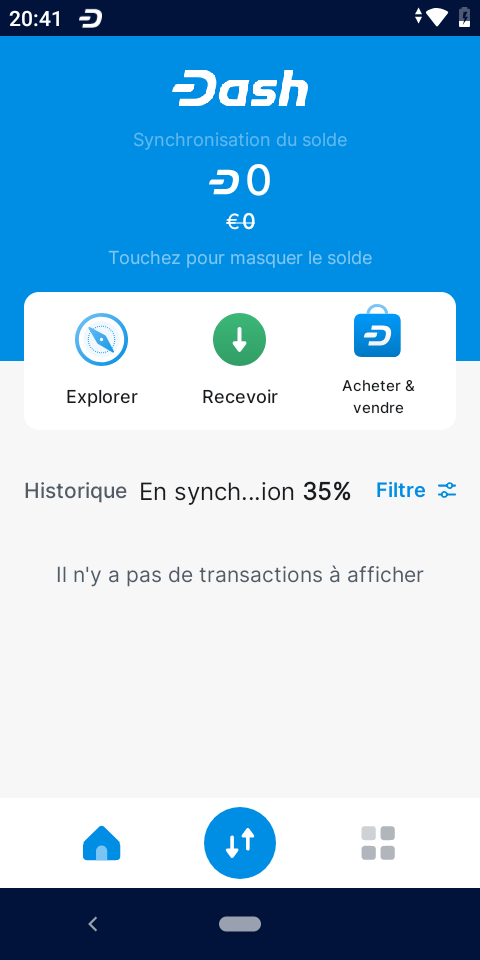 Comme c’est sur votre appareil que resteront stockées les données relatives à votre portefeuille, celui ci a besoin de se connecter avec le réseau dash (ici testnet) avant d’interagir avec d’autres portefeuilles. Il prend le temps de faire le tour, voir qui il y a par là et quelles sont les dernières nouvelles, c’est à dire quelles sont les dernières transactions...