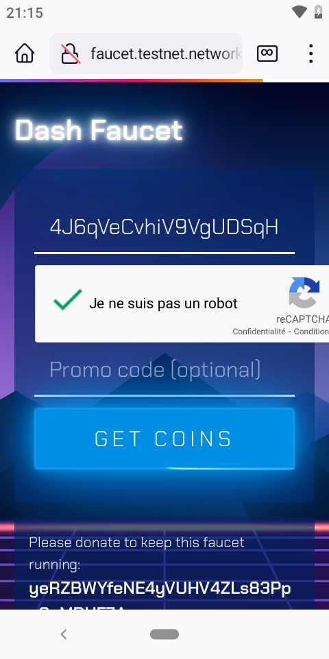 Si vous êtes isoléE mais que vous voulez participer en envoyant et recevant des dashTestnet vous pouvez utiliser cette adresse